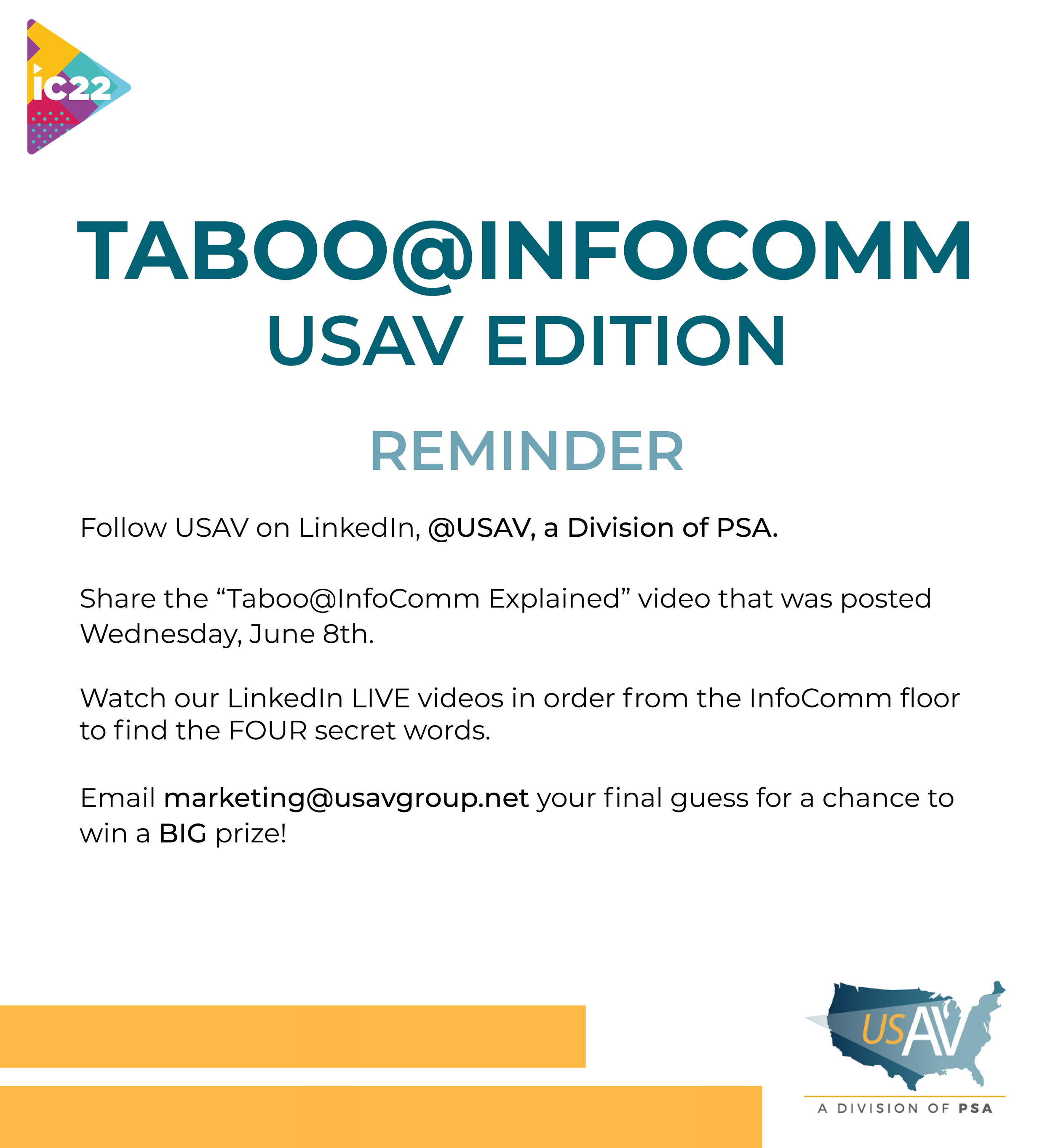 Taylor Lampar June 17, 2022 USAV Blog USAV Weekly Highlights: June 17th, 2022 Taylor Lampar June 17, 2022 USAV Blog Here is your recap of what USAV did this week!INFOCOMM RECAPTABOO@INFOCOMM CONTEST REMINDER Read USAV’s InfoComm 2022 Recap! READ HERE Did you figure out the secret phrase?TO BE CONSIDERED:Follow USAV on LinkedIn, @USAV, a Division of PSAShare the "Taboo@InfoComm Explained" video that was posted June 8th.Email [email protected] your final guess. What is Taboo@InfoComm? SECRET WORD 1 SECRET WORD 2 SECRET WORD 3 SECRET WORD 4